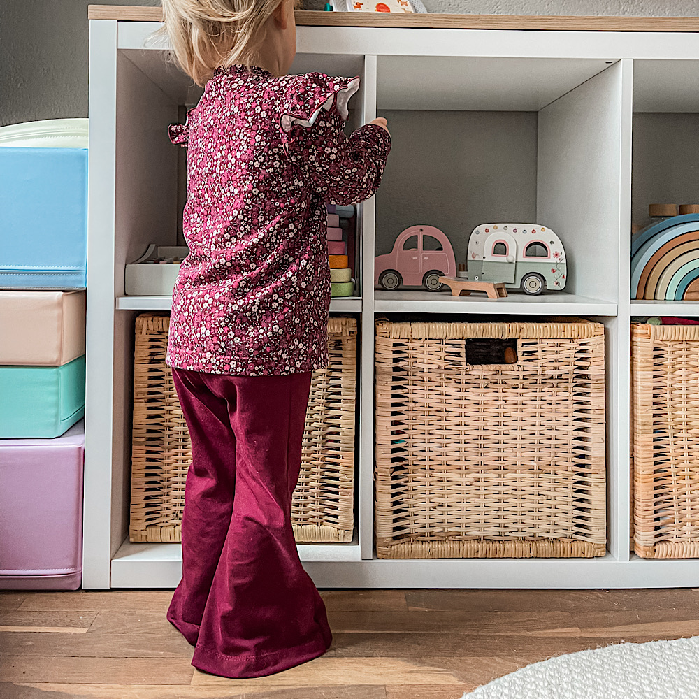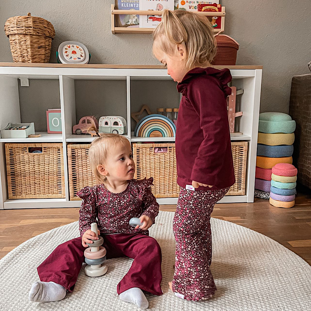 Deze handgemaakte effen bordeaux flared broek is een echte eyecatcher voor meisjes van maat 56 t/m 140. De zachte, comfortabele stof voelt fijn aan en biedt optimale bewegingsvrijheid. De flared pijpen geven een speels en trendy silhouet, terwijl het vrolijke bloemenpatroon in warme bordeaux tinten elke outfit een stijlvolle touch geeft. Perfect te combineren met een effen top of een bijpassende longsleeve voor een complete, fashionable look. Een handgemaakt item dat comfort en stijl moeiteloos samenbrengt.